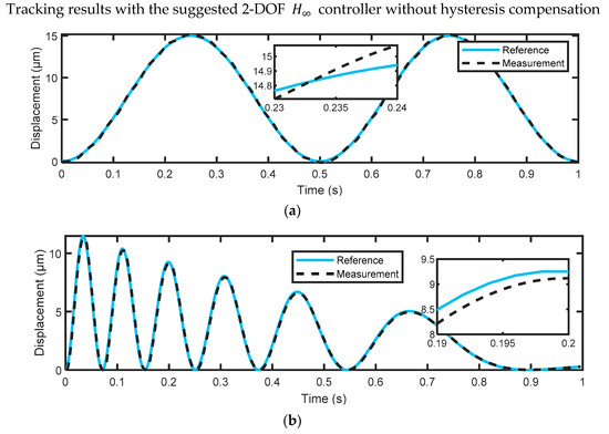 Tracking results obtained by the 2-DOF controller without hysteresis compensation for (a) reference signal A; (b) reference signal B.