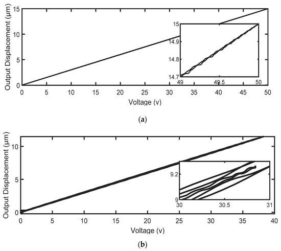Piezoelectric actuators (PEAs) are widely used in nanopositioning stages as they can achieve fast and accurate positioning compared with conventional actuators. The main drawback of piezoelectric actuators is that they contain smart materials that exhibit hysteresis behavior, degrading their performance and making them unsuitable for applications that require ultra-precise motion. The reason for this behavior is the change in polarization directions that occurs inside the smart material. This change causes distortion in strain, which is called inhomogeneous domain switching [1,2]. Hysteresis is usually observed as a complex nonlinear relationship between the input (reference signal) and the output (displacement). Therefore, it is difficult to describe the piezoelectric actuator’s dynamics, making the controller design tasks for the nanopositioning systems more difficult [3].