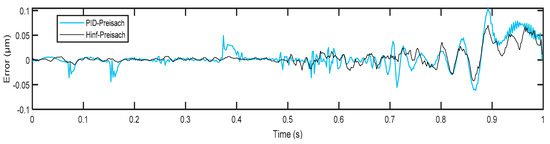 Table 5 shows the tracking performance for the proposed control scheme compared with the LSSVM-PID feedback controller, which has been proposed in our previous work [31]. It can be observed that the 2-DOF controller achieved better trajectory tracking performance than the traditional PID feedback controller, obtaining a 0.0212 μm RMSE on average while the PID achieved a 0.0241 μm RMSE on average. To further clarify the difference, the instantaneous tracking errors for both schemes were compared on test dataset B, as shown in Figure 21. These differences, in terms of mean RMSE and error levels, may seem small, but their effect is astonishing in nanoscale systems.