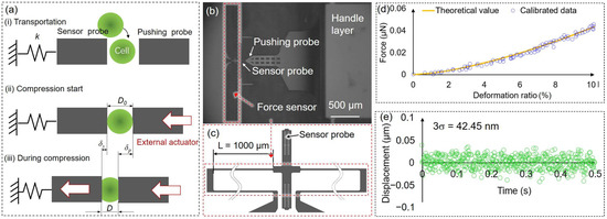 (a) Concept of the force measurement process; (b) image of the pushing probe and the force sensor; (c) the hollow folded beam structure functioning as a spring force sensor; (d) an example of the calibration data and theoretical value of the force sensor (the blue dots show the measurement date using the force sensor after calibration, and the orange curve represents the theoretical values); (e) the stability of the force sensor was evaluated by measuring the 3σ of displacement data of the sensor probe. D0: the original cell diameter; δs, δp: the displacement of the sensor and pushing probe; L: the length of the beam structure; σ: standard deviation.