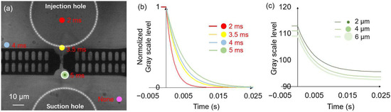 To evaluate the effect of the position and area of analysis region on the liquid exchange time, we analyzed changes in the gray scale level at different locations during the liquid exchange process, as shown in Figure 5a. To achieve the liquid exchange, the applied injection and suction voltages were altered from 0 to 30 v and 10 to 0 v, respectively (in the subsequent sections, the injection voltage changes from 0 to a are abbreviated as the injection voltage a, and likewise, the suction voltage changes from b to 0 are abbreviated as the suction voltage b), with a rising time of 1 ms. To eliminate the influence of background brightness on the analysis of the trend of grayscale value changes, we normalized the grayscale value changes on the y-axis in Figure 5b. The time constant τ represents the time for one system’s step response to reach approximately 63.2%, and it is used to characterize the liquid exchange time or the response time of the cell [27]. The fitting curve of the gray scale level data indicated the changes in the liquid exchange time at different positions [34]. At positions far away from the suction hole (indicated by the purple circle), the grayscale value remained almost unchanged. The liquid exchange time became shorter as the analysis region got closer to the injection hole. The yellow and green circles were located near the trapped cell, and a longer liquid exchange time was observed at the green circle, and the obstruction of fluid flow by on-chip probes is a possible reason. The liquid exchange time was shorter than 10 ms in all the selected analysis regions which demonstrated the achievement of millisecond liquid exchange by using this system. To ensure the reliability of the results, we estimated the liquid exchange time at the green circle position in subsequent experiments. Additionally, we further investigated the effect of the area of analysis region on grayscale value changes (Figure 5c). At the green circular position, we evaluate the grayscale value changes during the liquid exchange in concentric circular areas with diameters of 2, 4, and 6 μm. To illustrate the influence of background brightness on the analysis results, changes in grayscale values were not normalized in this figure. Owing to the background brightness changes at different positions, the curve had a slight shift, but the obtained liquid exchange times showed no obvious change. Therefore, the area of analysis position does not significantly affect the analysis result of the liquid exchange time.