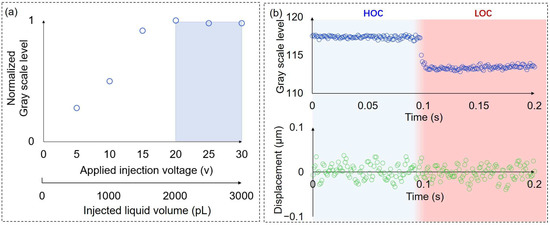 Based on the above analysis, we further investigated the effects of injection voltages on the liquid exchange degree (Figure 6a). In this experiment, the suction voltage was 10 v, and other parameters were consistent with the experimental conditions described above. The applied voltage and the corresponding injected liquid volume are shown in the x-axis of Figure 6a. The injected liquid volume corresponding to the injection voltage was calculated based on the change in the volume inside the silicon tube caused by the extension of the piezo stack. When the injection voltage was less than 20 v, the change in the grayscale value before and after the liquid exchange increased as the injection voltage increased. This indicated that the injected liquid volume was not sufficient to replace the diffused solution inside the injection barrel and the original solution surrounding the cell. When the injection voltage exceeded 20 v, the change in the grayscale value tended to be stable, which means the extracellular solution was completely exchanged. The injected liquid volume required for complete liquid exchange is dependent on the degree of diffusion which is correlated to the duration of contact between the injected solution (LOC) and the original solution on the surface of the chip (HOC). Therefore, the experiment should minimize contact time between the two solutions. In this experiment, the experimental procedure was optimized, and the contact time between the two solutions was reduced to approximately 3 s. In addition, it is also essential for the injected liquid volume to be significantly greater than the volume of liquid surrounding the cell. The liquid volume between the holes of the probe tip and the chip bottom surface was approximately 100 pL which was much smaller than that of the injected liquid volume. Given that the duration cannot be accurately controlled, we chose a larger injection voltage of 30 v to ensure complete liquid exchange in the following experiment.