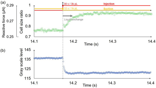 We measured the transient response of single cells using a system integrated with an open chip and a probe with a dual pump. The captured cells were compressed by on-chip probes, resulting in a deformation of approximately 20–30%. The probe tip was then positioned 6 μm above the surface of the on-chip probes. The injection voltage was 30 v while the synchronized suction voltage was 10 v to achieve the high-speed liquid exchange. Thus, the extracellular environment of the cell was replaced from the HOC solution to the LOC solution mixed with Rhodamine B. The high-speed camera recorded the displacement of the on-chip probe and simultaneously recorded the changes in brightness within the measurement area. Figure 7 shows one example of the transient response of a single cell and the corresponding gray scale level change in the liquid exchange process. We ignored the displacement of the pushing probe since it was stopped when the liquid exchange happened, and the end of the force sensor was fixed. Hence, the deformation of the single cell was the same as the displacement of the force sensor in the liquid exchange process. The cell size ratio in the vertical axis label of Figure 7a represents the ratio of the cell diameter after deformation to the original diameter. The cell responded to osmolarity change and swelled. The time constant of the response of this single cell was approximately 19 ms. Meanwhile, the liquid exchange time was evaluated using the gray scale level change time (Figure 7b), and the time constant was approximately 4 ms. We measured 9 cells, and the average value of the transient response times of the cells was 16.33 ms, while the standard deviation was ±4.47 ms. Additionally, the corresponding average value of the liquid exchange times was 3.33 ms, and the standard deviation was ±1.50 ms. The liquid exchange time is much faster than that of the response time of cells.