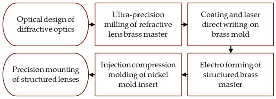 The process chain involves the ultra-precision turning of a brass substrate followed by spin coating of photoresist and laser direct writing of diffractive microstructures on the curved substrate. Afterwards, the mold insert for injection molding was fabricated using electroforming of the substrate. Diffractive structures and a refractive master substrate were aligned during the structuring process while additional passive alignment structures were included in the mold insert for encapsulation and alignment to additional lenses. The polymeric lens system was designed as a zero refractive element due to the combination of diffractive structures and the refractive surface shape. In combination with a second polymer lens, an encapsulated zero refractive element is presented. The polymer lenses were produced via injection compression molding and adjusted afterwards. A flow chart representing the process chain of the study is shown in Figure 2.
