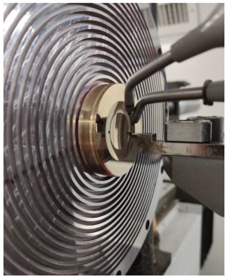 The curved master substrates were fabricated via ultra-precision turning on a Precitech Ametek Freeform 700A machine (Ametek Precitech Inc., Keene, NH, USA). A surface roughness of Ra < 10 nm was achieved via diamond tooling using a diamond lathe tool with a cutting edge radius of r = 0.0705 mm from DiaTec GmbH (Pforzheim, Germany). The brass master is shown in Figure 3.