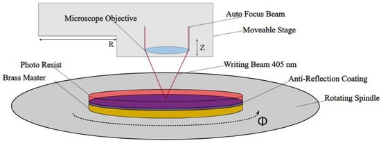 The experimental laser system is based on a Toptica BlueMode 05001 Laser (TOPTICA Photonics AG, Munich, Germany), operating at a wavelength of 405 nm. The machine is maintained in single-mode operation with an output power of 1 mW. Additionally, the laser exhibits a coherence length exceeding 25 m, providing the necessary characteristics for precise and controlled structuring of the photosensitive polymer. For this purpose, the inserts are spin-coated with a photosensitive polymer resist. Afterwards, the mold insert is fixed in the middle of a rotational base plate and the laser beam is focused onto the resin surface. The tunable z-position of the laser beam allows the resin to be hardened at different heights while the mold insert rotates, enabling the direct writing of diffractive gratings or Fresnel-like structures, as shown in Figure 4.