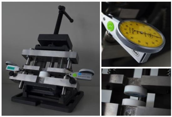 The apparatus shown in Figure 6 contains two spring-loaded steel plates supported on two axes. These can be moved relative to each other. Two cylindrical plates made of polytetrafluoroethylene (PTFE) are mounted on both plates and are used to support the lenses. PTFE was chosen as the contact material for the lens surfaces. Because of its mechanical and inert properties, optical surfaces are protected during joining. In addition, two dial gauges were installed. To align and join the optical components, the two opposing plastic components are mounted between the PTFE plates. If both dial gauges indicate the same values, adhesive is applied to the adhesive gap provided. Loctite 406 (Henkel AG & Co. KGaA, Düsseldorf, Germany) was chosen as an adhesive because of its low viscosity and short curing time. Due to the low viscosity, the adhesive is drawn into the adhesive gap after application and distributed via capillary forces.