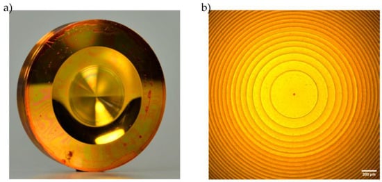 The photo curable resist was spin-coated onto the brass surface and resulted in a measured layer thickness of 2.1 µm. The high reflectivity of the brass surface was reduced by adding an additional 200 nm thick layer of anti-reflection coating (AZ® BARLi®-II). The resist was structured via laser direct writing afterwards, resulting in concentric structures. The microstructured surface is shown in Figure 7.