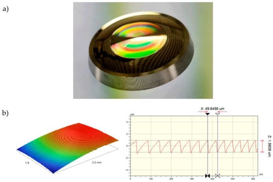 Electroformed nickel substrate machined for injection molding: (a) the molding insert with diffractive structures; (b) WLI measurement of the nickel substrates’ microstructured surface.