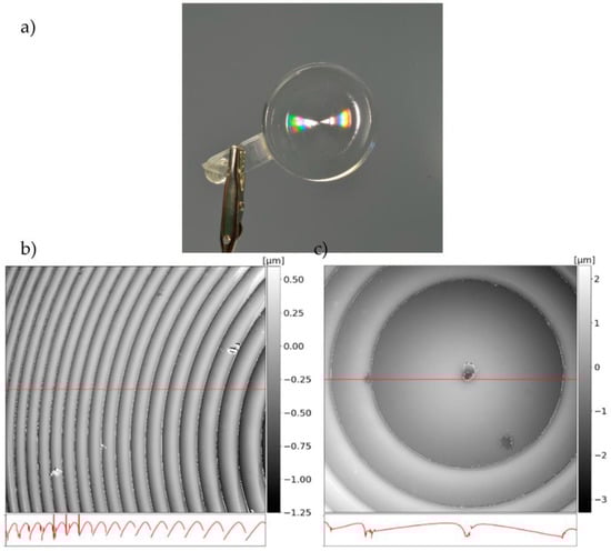 Injection-molded zero refractive element in PA6 Trogamid MyCX: (a) the diffractive structures were successfully transferred into the polymer surface as shown in (b); (b) NPMM measurement of the lens; (c) a small defect in the center of the lens was transferred into the polymer surface as well as the microstructures.