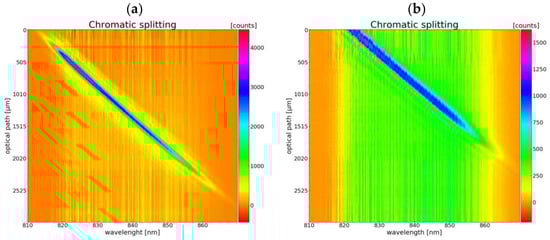 Chromatic longitudinal aberrations of (a) encapsulated zero refractive element—not glued and (b) glued zero refractive element; the adhesive process seems to have had a major impact on the signal distortion.