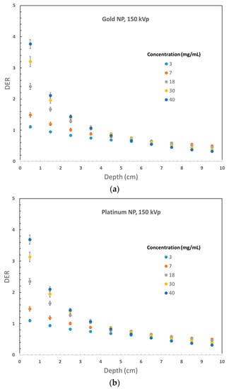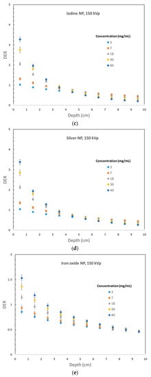 In Figure 2 and Figure 3, with the same nanoparticle material and photon beam energy, increasing nanoparticle concentration led to an increase in DER values. This is due to the addition of more nanoparticles to the phantom, resulting in a higher compositional atomic number and, thus, more secondary electrons produced in the phantom. Gold nanoparticles in Figure 2a and Figure 3a showed a high DER value larger than 3 at the phantom surface with a nanoparticle concentration of 40 mg/mL. However, a low nanoparticle concentration of around 3 mg/mL resulted in a DER value close to 1. Similar trends were observed for platinum, iodine, silver, and iron oxide nanoparticles. For iron oxide nanoparticles in Figure 2e, DER values were lower than one at nanoparticle concentrations below 7 mg/mL due to the shielding effect being greater than the dose enhancement effect along the phantom depth. Therefore, a high nanoparticle concentration of over 30 mg/mL is recommended for adequate dose enhancement in orthovoltage nanoparticle-enhanced skin therapy.