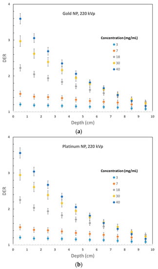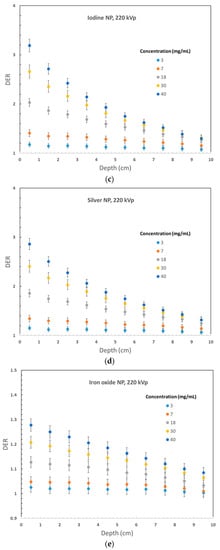 When comparing the DER values of gold nanoparticles at the same depth using 105 kVp (Figure 2a) and 220 kVp photon beams (Figure 3a), it can be observed that the maximum DER values were 3.77 and 3.59, respectively. The lower energy photon beam had a DER value that was 5.0% higher than that of the higher energy beam. This is due to the fact that in the kV energy range, the photoelectric cross section is proportional to 1/E3.5, where E represents the energy of the radiation beam []. For other nanoparticles, it was found that the DER values for platinum, iodine, silver, and iron oxide were 3.67%, 2.78%, 1.18%, and 1.17% higher, respectively, when the photon beam energy was changed from 220 kVp to 105 kVp. The lower values of the percentage increase can be attributed to the decrease in compositional atomic number within the phantom.