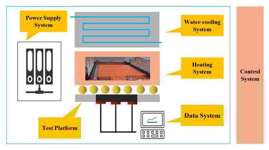 As a common radiation heating equipment in structural thermal testing, the quartz lamp array has the characteristics of small thermal inertia, easy control and strong adaptability to complex structures; thus, it is widely used in aircraft structure thermal testing [,,]. The high-power infrared radiation long-time thermal assessment platform is composed of power supply system, test platform, water cooling system, heating system, data system and control system as shown in Figure 1. The quartz lamp array of the heating module consists of 30 quartz lamps arranged in parallel and side by side. The quartz lamp spacing is 2 cm. The quartz lamp filament heating length is 660 mm. The length of the quartz lamp tube is 760 mm. The maximum heating power is 150 kW and the heat flow density of the uniform area is about 160 kW/m2. The surface heat flux control accuracy of the specimen is less than 3 kW/m2. It can realize heterogeneous controllable heat flow load. The lamp heat flow is independently controllable; the control accuracy is better than 1 kW/m2 and a high-temperature environment is provided by means of radiant heating. During the experiment, the sample is first placed on the test platform. Then, the heating power of the quartz lamp is controlled by a temperature controller, which gradually warms up the sample. At the same time, a data collector records the temperature change in the sample and other relevant data.