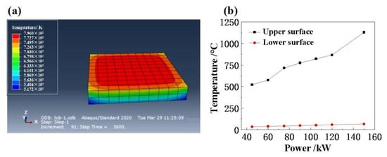In this paper, choosing to use simulation to study some thermal conductivity of the material can significantly reduce the costs related to experiments, and can also provide stronger theoretical guidance for the preparation and practical application of materials. Therefore, we performed simulations before the experiments. The heat transfer module is analyzed using Abaqus element software. From the current literature of finite element analysis of heat flow sensors, Abaqus has more prominent advantages in nonlinear calculation, and in the software we simulate the density of heat flow by adding a boundary heat source. The sample size was set to 100 mm × 100 mm × 15 mm, the material characteristic parameters are shown in Table 1 and the initial environmental temperature is 20 °C. The three-dimensional temperature distribution of the concrete model structure of molten quartz ceramics is shown in Figure 2a, in which it can be found that the top layer of the material is at a higher temperature and the bottom layer is at a lower temperature, which can effectively protect it from the influence of the subsequent temperature increase in practical use. Therefore, in Figure 2b, we investigate the effect of quartz lamp arrays with different input powers on the temperature distribution at the top and bottom of the sample. From the calculation results of Abaqus finite element software, it was suggested that the upper and lower surface temperature of the sample increased with the increase in quartz lamp control power. When the input power is 45, 60, 75, 90, 105, 120 and 150 kW, the upper surface temperature of the sample is 522.85, 574.54, 715.25, 773.85, 822.85, 866.85 and 1129.85 °C. However, the highest lower surface temperature of the sample is 65.30 °C.