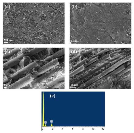 Scanning electron micrographs of samples at different scales: (a) 200 nm, (b) 1 μm, (c) 2 μm and (d) 10 μm. (e) Energy spectrum analysis of experimental samples.