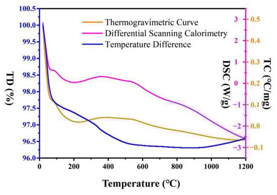 Dynamic thermal analysis is important for the study of the thermal properties and thermal stability of materials. Therefore, as shown in Figure 4, we studied the results of dynamic thermal effect analysis for samples up to 1200 °C. During the dynamic thermal effect test, the total weight loss of the sample was about 3.9625%. This is due to the low volatile matter content of the sample after the high-temperature combustion [,,]. The general trends in the thermogravimetric curve (TC) can be divided into three obvious loss intervals. The first significant loss interval is between 25 and 200 °C. The weight loss rate is 2.568%. This weight loss is caused by the desorption of the adsorbed water and decomposition of the material; such weight loss is usually consistent with the temperature range of the first weight loss peak in differential thermogravimetry (DTG) []. This shows that desorption of adsorbed water and decomposition of the material occur in this temperature range, which is a natural process when samples are exposed to high temperatures. The second significant weight loss occurred in the temperature range of 200 to 800 °C. The weight loss rate was about 1.118%. According to the differential scanning calorimetry (DSC) curve, there is a small endothermic effect at 352.21 °C. This weight loss can be attributed to a phase transition or crystal transition of the sample. This indicates that the sample has undergone a phase transition or crystal transition reaction within this temperature range. The third significant weight loss occurred in the temperature range between 850 °C and 1200 °C. The mass of the substance increased. The DSC curve continued to decrease. No obvious exothermic peaks were observed. This shows that some complex reactions have occurred in this temperature range, which leads to an increase in the sample quality.