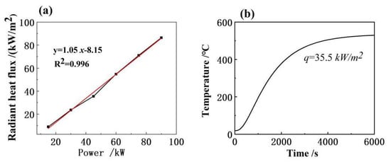 (a) Sample surface heat flux variation when the input power is 15, 30, 45, 60, 75 and 90 kW. (b) Curve of upper surface’s temperature showing that the heat flow density is 35.5 kW/m2.