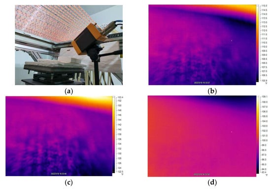 Results of the upper surface temperature uniformity test. (a) Photograph of the infrared camera temperature measuring device. (b–d) The surface temperature distribution of the measured sample at t = 0 s, 120 s and 240 s.
