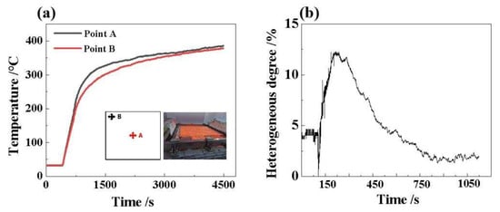 When studying the thermal properties of materials, the non-uniformity of radiation surface temperature is a very important parameter [,]. This parameter can be defined by the temperature difference in the irradiated surface temperature between two points; that is, it represents the average temperature of two points on the irradiated surface. In order to better explore the characteristics of the distribution of sample surface uniformity at high temperatures, a type k thermocouple was used to measure the temperature at different locations on the sample surface [,]. When the input power of quartz lamp is 1 kW, we measured the temperature changes at the center and the vertex angle, as shown in Figure 7a. The results show that the surface temperature of the sample presents a distribution pattern of high center and low surround, which is basically consistent with the results of finite element simulation and is also related to the Gaussian distribution of the light source spectrum [,,]. As time progresses, the temperature at the center and the edge of the sample is basically the same, which indicates that the heat transfer process is close to becoming stable. Figure 7b shows that the overall trend in the uncertainty of the upper surface temperature over time increases and then decreases, with a maximum uncertainty of 12.28%. This result shows that when studying the thermal characteristics of a material, we need to consider the influence of time and space on the temperature distribution. In addition, we need to analyze and process the measurements results comprehensively to obtain more accurate data. In a word, this study provides an important reference for us to understand the thermal properties of materials in depth.