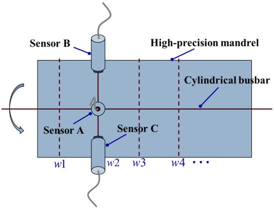 In this paper, the research object is a high-precision mandrel. The placement position of the sensors of the three-point method is shown in Figure 1. Sensors A, B, and C are arranged on the same cross section of the high-precision mandrel. Three sensors need to be fixed on the slide by an integrally processed fixture, moving with the slide along the cylindrical busbar of the high-precision mandrel to achieve the purpose of measuring different cross sections. In Figure 1, are the cross sections of the high-precision mandrel to be measured. According to the three-point roundness error separation technology, the in situ measurement of roundness can be realized by using the three sensors, while the radial error and the least square circle center of each cross section can be realized through harmonic analysis. With radial error known, the average radius of each cross section can be separated from the data of Sensor A. Thus, the three elements of reconstructing the cylindrical shape of the high-precision mandrel can be obtained, and the following will give the specific theoretical analysis process.