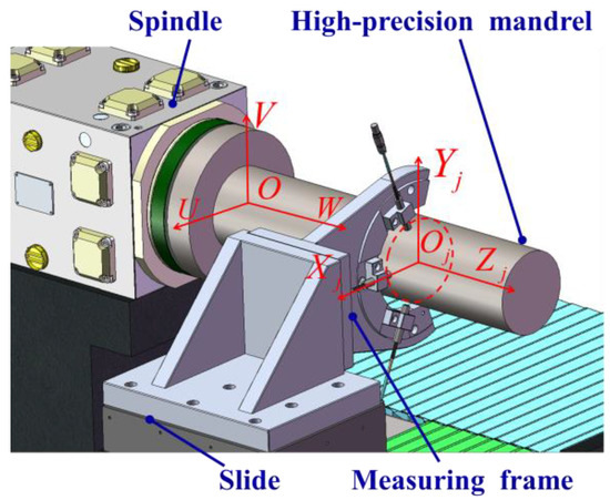 As shown in Figure 2, the model of the in situ measurement device mainly consists of a spindle, slide, high-precision mandrel, and measuring frame. The measuring frame is composed of sensors and measuring fixtures. The high-precision mandrel is fixed on the spindle of the ultra-precision lathe and can rotate at a constant speed with the spindle. The measuring frame is fixed on the slide and can move parallel to the spindle axis. To describe the error relationship of in situ measurements more clearly, coordinate systems are established as shown in Figure 2. Firstly, take the intersection point of the average line of the rotation axis and the spindle end face as the origin and establish the absolute coordinate system. The coordinate axis and are located horizontally and vertically, respectively, while the coordinate axis coincides with the average line of the axis of rotation of the spindle. Secondly, taking the intersection of the axes of the three sensors as the origin , the measuring coordinate system of cross section is established. The coordinate axis , and are parallel to the coordinate axis , and of the absolute coordinate system, respectively. The number can be taken as , and is the total number of the measured cross sections.