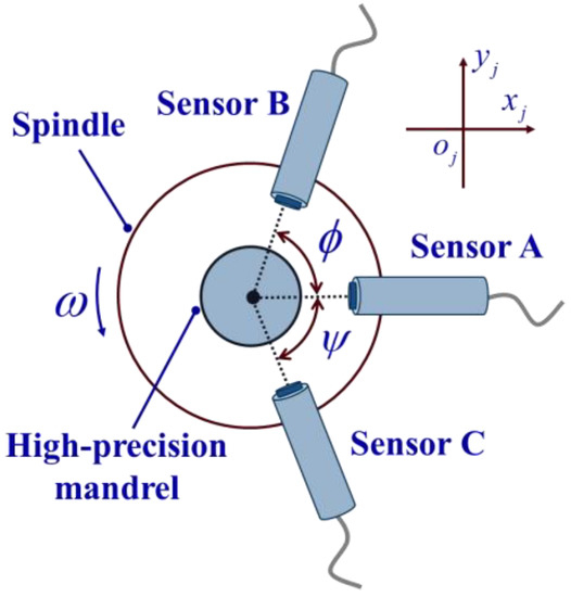K. Stepien [2] systematically introduced three methods of cylindrical shape measurement, including the multi-probe method, the V-block method, and the Articulated Arm Coordinate Measuring Machines. The advantages and disadvantages of the three methods are compared in the paper, and it is considered that the multi-probe method is the most suitable method for carrying out high-precision in situ measurement of small-sized cylindrical workpieces. The multi-probe method uses multiple sensors to collect the cylindrical shape data synchronously and integrates the data for error separation. Multi-probe methods mainly include the three-point method, four-point method, and five-point method.