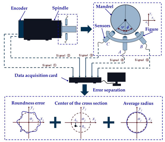 - Baek, S.-W.; Kim, M.-G.; Lee, D.-H.; Cho, N.-G. Multi-Probe System Design for Measuring the Roundness and Rotation Error Motion of a Spindle Using an Error Separation Technique. Proc. Inst. Mech. Eng. Part B J. Eng. Manuf. 2019, 233, 1547–1560. [Google Scholar] [CrossRef]