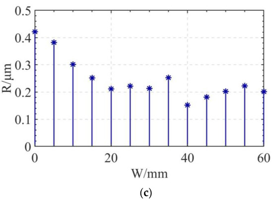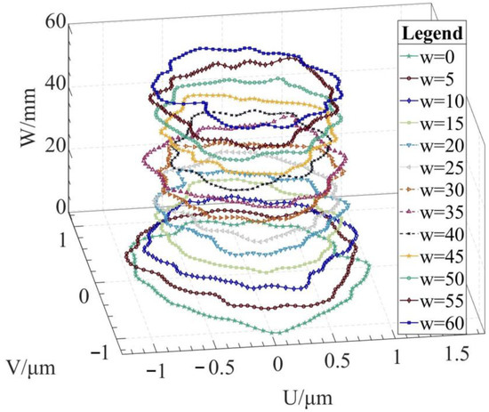 The reconstruction method of the cylindrical shape of the high-precision mandrel is to measure the profiles of finite cross sections of the mandrel, and then fit the shape of the high-precision mandrel. Figure 8 and Figure 9, respectively, show the spatial distribution and plane distribution of each cross section measured. We can clearly observe the change in the profile, the relative position, and the difference in the relative radius of each cross section. Figure 10 visually reflects the deviation of the center position of each cross section and the deviation of the average radius of each cross section.