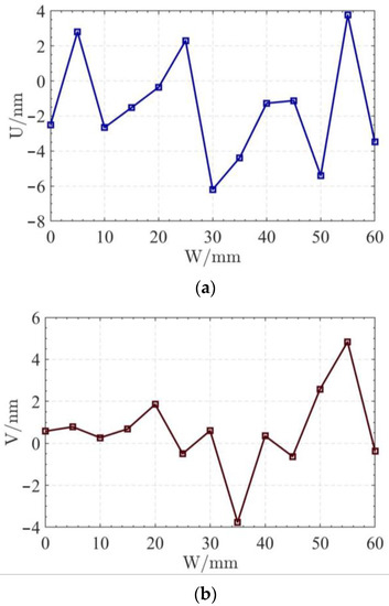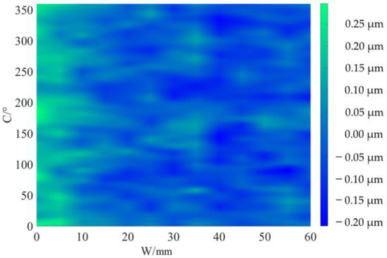 The right side of the equal sign in Equation (5) can be regarded as the sum of five terms. Among them, the first term is only related to , so it is the error of the radius of each cross section. The second term has nothing to do with , which means that the centers of each cross section are on a straight line, and the offset between the straight line and datum axis is . The third term indicates that the center of each cross section is on a straight line with an inclination of to the datum axis. The fourth term represents the location of the center of each cross section. The fifth term represents the roundness error of each cross section. It can be known that the second and third terms only indicate the relative position between the axis of the high-precision mandrel and the datum axis. Only the first, fourth, and fifth terms determine the cylindrical shape of the high-precision mandrel, which is consistent with the statement in reference [23,24].