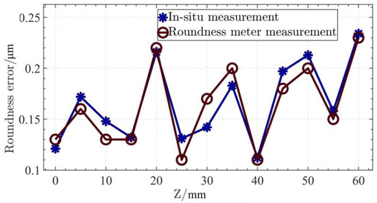 According to Table 2, the in situ measurement results of the roundness of each cross section and that of the roundness meter can be plotted in Figure 15. From Table 2 and Figure 15, it can be known that the in situ measurement results of each cross section are basically the same as those of the roundness meter, and the trend of change is the same. The maximum deviation of roundness of each cross section is 30 nm, which is about 17.65% of the measurement result of the commercial roundness meter. Considering the influence of the measurement environment, the measurement uncertainty of the in situ measurement system is within the acceptable range. By averaging multiple measurements, the accuracy of measurement results can be ensured.