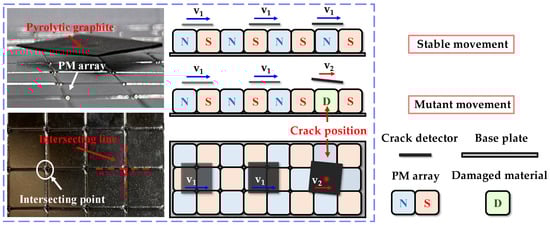 In this study, we aimed to apply the pyrolytic graphite levitation technique as a non-destructive test for identifying cracks and defects in magnetic materials, as shown in Figure 1. A stable magnetic field used for pyrolytic graphite was generated by a PM array, which was constructed using multiple small magnets arranged in intersecting points and lines. The occurrence of surface or internal damage or cracks in permanent magnets alters their magnetic field. The pyrolytic graphite generates an eddy current damping effect as it approaches the crack due to a sudden alteration in the magnetic field, altering its in-state of planar motion, thereby facilitating precise identification of the crack’s location. This method is valuable, as it enables non-contact testing that minimizes the risk of damaging the tested materials, improves the test’s efficiency and reduces the overall costs.