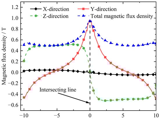 To begin with, we evaluated the distribution of the magnetic flux density in X, Y and Z directions above the PM array, as shown in Figure 2, where the total magnetic flux density is B = B x 2 + B y 2 + B z 2 . The magnetic flux density is mainly distributed at the intersecting line of the PM array. The further away it is from the intersecting line of the PM array, the lower the magnetic flux density.