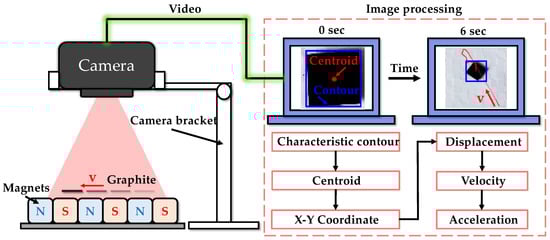 where V (k) is the velocity of centroid in frame K; Cent (k, 1) and Cent (k − 1, 1) are the X coordinates corresponding to the centroid of pyrolytic graphite in frames K and K − 1, respectively; Cent (k, 2) and Cent (k − 1, 2) are the Y coordinates corresponding to the centroid of pyrolytic graphite in frames K and K − 1, respectively; ∆t is the time interval; D is the actual side length of the pyrolytic graphite; DIAM is the pixel length corresponding to the calibration line and a (k) is the acceleration of the pyrolytic graphite’s motion in frame K. These motion parameters can efficiently calculate the in-plane force acting on the pyrolytic graphite.