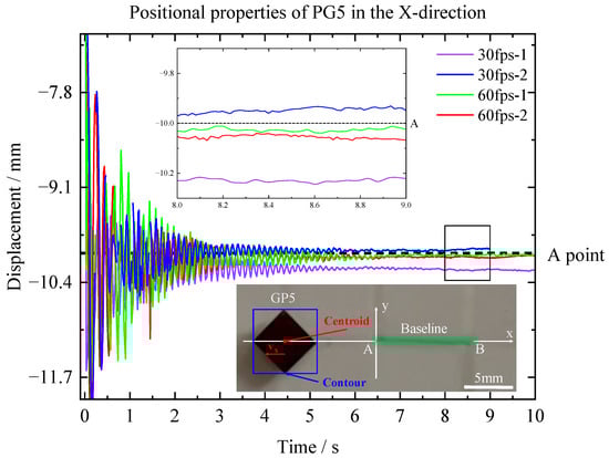 The positional characteristics of pyrolytic graphite during in-plane oscillation were also examined. In this experiment, we used pyrolytic graphite with dimensions of 5 × 5 × 0.5 mm3 (PG5). Firstly, a baseline was drawn on the PM array, and its two endpoints were labeled as A and B. To eliminate the impact of the video frame rate on the parameters of PG5, we released the PG5 at the same location and captured the motion parameters of its centroid using two different video frame rates (30 fps and 60 fps). Due to the in-plane force, the oscillation displacement of the pyrolytic graphite gradually decreased and ultimately stabilized at a specific point. The displacement between the centroid of the pyrolytic graphite and Point A in the X-direction was determined, as depicted in Figure 5. The analysis revealed that the centroid of the pyrolytic graphite will levitate at the intersection point of the PM array.