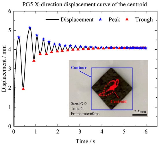 We also examined the damping ratio of pyrolytic graphite during in-plane oscillation. The in-plane force caused a gradual reduction in the oscillation displacement of pyrolytic graphite. PG5 and PG10 were used to investigate this phenomenon. The centroid displacement curves in the X-direction were obtained by releasing the pyrolytic graphite at the same point. Figure 8 displays the displacement curves in the X-direction for PG5.