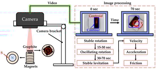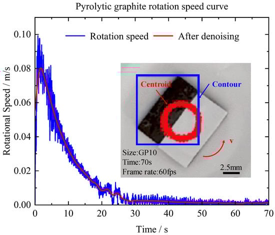 During the process of magnetic levitation, pyrolytic graphite undergoes not only in-plane translational motion, but also in-plane fixed-axis rotational motion. When pyrolytic graphite undergoes fixed-axis rotation, the rotational friction force hinders its motion. Therefore, this part investigated the force and coefficient of friction ofPG10 during fixed-axis rotation using a polarity-crossing annular PM array and a white sticker to cover half of the PG10’s surface. The experimental setup for fixed-axis rotation is shown in Figure 9, where the rotational speed and acceleration were obtained by scale conversion, as represented in Figure 10 and Figure 11. To remove noise, it was necessary to filter the data of the fixed-axis rotational speed of graphite. The de-noised rotational speed is depicted by the red line in Figure 10, while the blue line represents the original dataset.