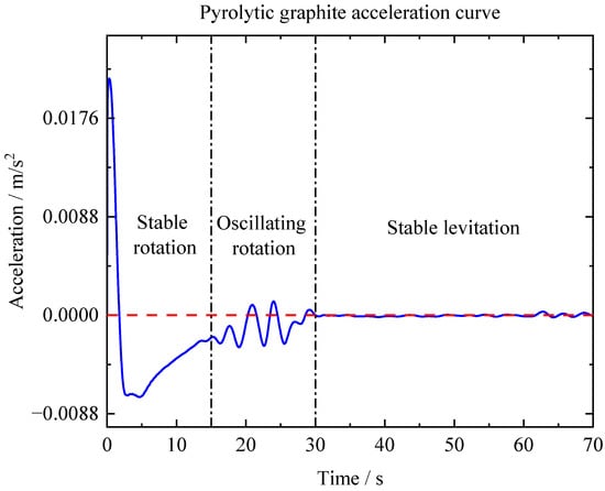 As shown in Figure 10, the stable rotation stage occurred for 0–15 s. Over time, the rotational speed gradually decreased, and the velocity and acceleration curves exhibited a relatively smooth trend. The stage of oscillating rotation occurred at approximately 15–30 s, when pyrolytic graphite exhibited an unstable rotation pattern characterized by oscillations rather than a stable cycle. After 30 s, the motion of pyrolytic graphite tended to stabilize, and PG10 eventually achieved stable levitation on the circular PM array.