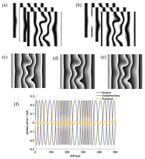 The simulated results are shown in Figure 1, where the simulation parameters are N = 3 and R = 1.5. Figure 1a,b show the original and π/3 shifted saturated three-step phase-shifting fringe patterns. The original phase map calculated using the original fringe patterns and the complementary phase map calculated using the π/3 shifted fringe patterns are shown in Figure 1c,d, respectively. The final phase map obtained by averaging the original phase map and the complementary phase map is shown in Figure 1e. To better illustrate the compensation method, phase error cross sections of the original phase map, the complementary phase map and the phase map using the proposed method are shown in Figure 1f. The phase error distributional tendencies of the original phase and the complementary phase are opposite, which verifies the principle in Section 2. It can be seen from Figure 1f that the phase error of the final phase was reduced effectively by using the proposed method.