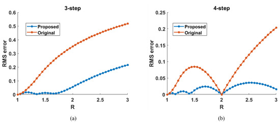 To quantitatively analyze the phase errors, root-mean-square (RMS) error using three-step and four-step PS algorithms with different saturation degrees (R = 1, …, 3) were evaluated, as shown in Figure 2. The phase error using a three-step PS algorithm before compensation increased largely with the increase in the saturation degree, as shown in Figure 2a. In contrast, the phase error after compensation was reduced to a low level when , and reduced more than half when R > 2. The phase error using a four-step PS algorithm reached its minimum when R = 2, and it was reduced effectively after the proposed compensation method, as shown in Figure 2b.