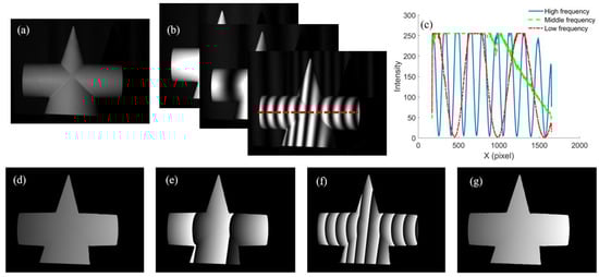 In order to verify the effectiveness of the proposed saturation-induced phase error compensation method, experiments were performed on a geometric plaster model as shown in Figure 3a. Figure 3b shows the captured fringe patterns of three frequencies, and the corresponding intensities of the dashed line are shown in Figure 3c, where the fringe intensities were saturated. The wrapped phase maps of the low frequency, middle frequency and high frequency were obtained using the proposed method, and are shown in Figure 3d–f, respectively. The continuous phase map of the high frequency obtained using a temporal phase unwrapping algorithm is shown in Figure 3g. The results verified the proposed method were appropriate for projecting both low and high frequency fringes.