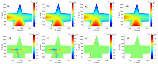 Figure 4a shows the phase reconstruction obtained from the original fringe patterns where the saturation-induced error was obvious (i.e., ripples on the surface). Figure 4b shows the phase reconstruction obtained from π/N-shifted fringe patterns, and the saturation-induced error was also obvious. To verify the phase error model of the proposed method, the captured images with and without Fourier filtering were used for obtaining the phase maps as shown in Figure 4c,d. It demonstrated that both methods with and without Fourier filtering could greatly reduce the measurement error. To quantitatively evaluate the performance of the proposed method, a 16-step phase-shifting algorithm was adopted to obtain the ground truth of the measured object []. The phase error maps of phases in Figure 4a–d are shown in Figure 4e–h, respectively. The mean absolute error (MAE) and the RMS error using the original fringe patterns were 0.1879 rad and 0.0254 rad, respectively. The result using π/N-shifted fringe patterns had a close error distribution: an MAE of 0.2169 rad and an RMS error of 0.0276 rad. The RMS error using Fourier filtering was reduced to 0.0175 rad, while the MAE was increased to 0.4160 rad due to the large errors at the object edges. In contrast, the MAE and the RMS error using the proposed method without Fourier filtering was reduced to 0.0702 rad and 0.0083 rad, respectively. The comparison of the above experimental results is shown in Table 1. The results demonstrated that the proposed method could reduce the phase error effectively in full field and avoid the errors at the object edges.