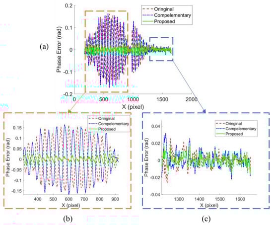 The phase error of the original phase, the complementary phase and the proposed phase on the dashed line in Figure 3b are plotted in Figure 5a. The saturated region (in orange dashed box) and the unsaturated region (in blue dashed box) is enlarged in Figure 5b,c, respectively. In the unsaturated region, the phase errors of the above three phase maps had a similar distribution at a relatively low level. In contrast, in the saturated region, the phase error of the original and the complementary phases were opposite and were cancelled out by averaging the phase maps.
