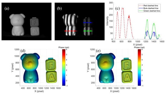 In order to evaluate the performance of the proposed method for an HDR scenario, three objects with different reflectivity were measured. Figure 9a shows the measured objects, one dog model and two letter blocks, and Figure 9b shows one of the captured fringe patterns. The intensity cross sections of the dashed line on the three objects are shown in Figure 9c, and different intensity ranges demonstrated that the objects had different reflectance. The result using the original fringe patterns and the result using the proposed method are shown in Figure 9d,e, respectively. The phase maps were reconstructed successfully, both using the original fringe pattern method and the proposed method, where the fringe patterns were not saturated (on letter blocks). When the intensity saturation occurred, the result using the original fringe patterns suffered from saturation-induced error (on the dog model), while the result using the proposed method had less error. The experimental results showed that the proposed method had a better performance on suppressing saturation-induced errors caused by high reflectivity, and could be used for HDR scenarios.