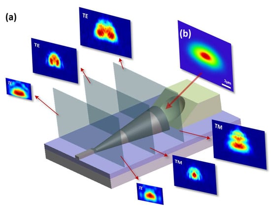 Before the fabrication of the device, the optical simulation was carried out by using Lumerical FDTD software, and the 3D structure was designed and optimized. The half-cone coupler was gradually reduced from a semicircle with a curvature radius of 3.5 μm to a strip waveguide with a cross-sectional area of 2 μm × 1 μm. The length of the half-cone coupler is 55 μm. We set the light source as a TE/TM fundamental-mode Gaussian light source with a wavelength of 1550 nm and MFD of 6 µm to couple it with the end face of the half-cone coupler. The simulation result is shown in Figure 2a. By setting monitors in each section of the half-cone coupler, we found that the electric field distribution of both the TE and TM fundamental modes show a semicircular morphology during transmission. It can be concluded that, different from the invert edge coupler, which amplifies the pattern spots through the tip waveguide, the half-cone coupler is a type of adiabatic device, and the mode profile distribution of it is mainly determined by the external profile of its section. In contrast, the widely used inverted-tapered-edge coupler achieves slab amplification and low insertion loss through tip waveguides and cladding devices, and the end-face size of the cladding is basically the same as that of the single-mode fiber.