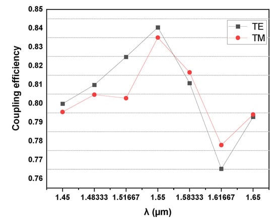 The coupling efficiency of the half-cone coupler at different wavelengths is also simulated by using FDTD. Figure 3 shows that the coupling efficiency is highest at 1550 nm and is higher than 76.5% (1.16 dB) over the entire simulation wavelength range (1450–1650 nm).