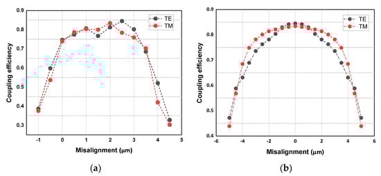 The coupling efficiency of the 3D coupler was simulated by using the sweep function of FDTD. As shown in Figure 4a,b, the coupling efficiency of the half-cone coupler is the highest when in the TE polarized mode, which is 84.5%, and it is 83.5% in the TM po-larized mode. For the designed 3D half-cone coupler, the simulation results show that although there is a certain mismatch between SMF with MFD of 6 µm and the section size of the edge coupler, the design of the 3D half-conical structure enables the vertical edge coupler to achieve a high coupling efficiency and a large coupling tolerance at the wavelength of 1550 nm. The 3 dB tolerance of the half-cone coupler in the horizontal direction is at least greater than 9 µm (±4.5 µm), and the 3 dB (50.12%) tolerance in the vertical direction is at least greater than 5 µm, as shown in Figure 4.