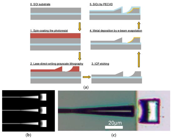 Micromachining steps of vertical optical edge coupler: (a) the process flow diagram, (b) gray layout image, and (c) a view of the object under optical microscope.
