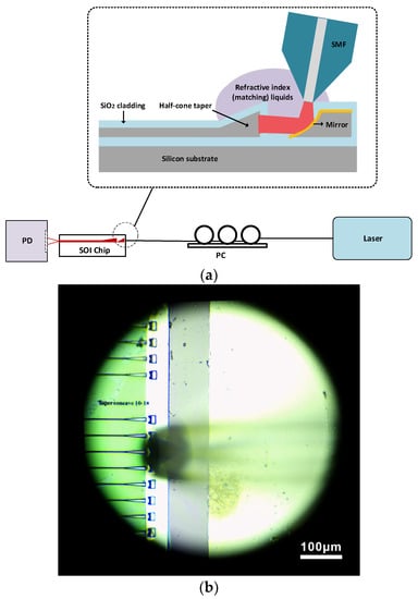 The coupling efficiency of the manufactured 3D vertical optical coupler was tested. As shown in Figure 6, we assembled a set of optical coupling test systems, including a fiber-coupled laser at a wavelength of 1550 nm, single-mode fiber patch cable, polarization controller, large-area detector and several fixed fixtures. First, the light emitted from the laser is adjusted by a polarization controller. Then, the transmitted light passes through a single-mode fiber and exits at the tip of the tapered bare fiber. The MFD of the tapered fiber is 6 µm. During the dynamic coupling process, the tapered fiber always maintains a fixed inclination angle with the mirror, and the end face of the taper fiber should be as close to the concave mirror as possible. In order to reduce reflection and stray light at the end face of the half-cone coupler during coupling, a refractive index matching liquids with a refractive index of 1.43 was used to wrap the end face of the edge coupler, the concave mirror and the tip of SMF. The output power on one side of the waveguide was received by a large-area detector, and the ratio of the output power obtained from the waveguide was the coupling efficiency that we focused on.