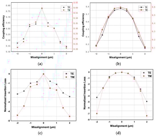 Misalignment tolerances of vertical optical coupling: (a) the coupling efficiency in the X direction; (b) the coupling efficiency in the Y direction, (c) normalized insertion loss in the X direction, and (d) normalized insertion loss in the Y direction.